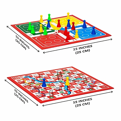 {ππ’π‘π§ππ‘π§π¦ & π£π₯π’ππ¨ππ§πππ§ππππ¦} β 1 x Double-sided Playing Board (Ludo, Snakes and Ladders), 16 x Pawns (Goti) in 4 colours, 1 x Dice, Weight β 200 grams (0.200 kg.) Box Dimensions β 28 cm (L) x 14 cm (W) x 2.5 cm (H) Board Dimensions β 25 cm (L) x 25 cm (W)